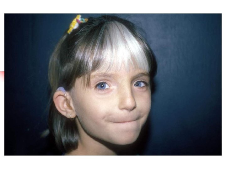 Waardenburg syndromes 1. 2. 3. 4. Bilateral or unilateral sensorineural hearing loss in association with defects in tissues derived from neural crest cells pigmentary abnormalities hair, skin and eyes hearing loss is due to defective migration of melanocytes info the intermediate layer of the stria vascularis genetically heterogeneous; inheritance AD four clinical subtypes