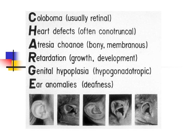 Stickler syndrome – sensorineural hearing loss, high frequency, progressive Myopia, retinal detachment Arthropathy Mid-face hypoplasia, cleft palate, micrognathia Gene defect: COL 2 A 1, COL 11 A 1, – Inheritance autosomal dominant – – COL 11 A 2