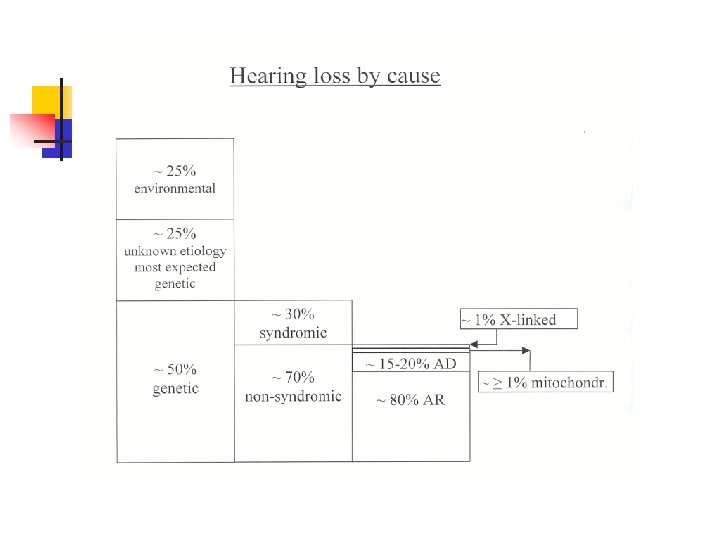 Most important genes involved in non-syndromic hearing loss Chromosomal location Locus /mutation 13 q 11 -12 Gene symbol Inheritance Protein Function DFNB 1/DFNA 3 GJB 2 AR/AD Conexin 26 Gap junction GJB 6 AR/AD Conexin 30 Gap junction 7 q 31 DFNB 4 SLC 26 A 4 AR pendrin Anion transporter 14 q 12 -13 DFNA 9 COCH AD cochlin Extracellular matrix protein mitochondriu m 1555 A>G MTRNR 1 Mitoch. 7445 A>G MTTs 1 12 Sr. RNA t. RNA serine 7472 ins. C 7511 T>C Xq 21. 1 DFN 3 POU 3 F 4 XL domain class 3 Pou Transcription factor 4 p 16. 1 DFNA 6/14/38 WFS 1 AD wolframin ER transmembrane protein