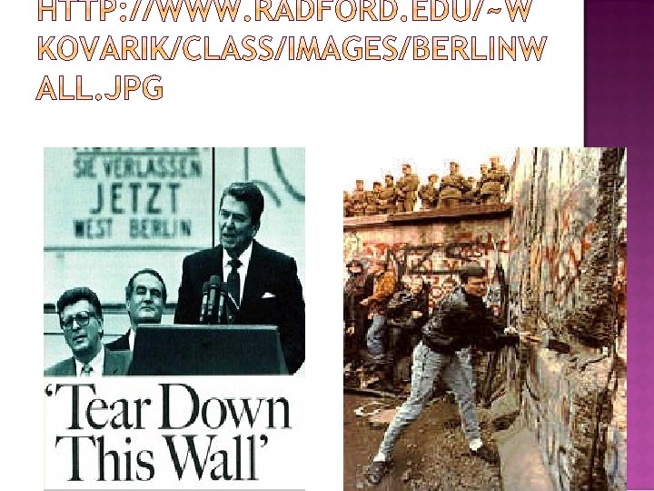 Challenged moral legitimacy of SU Berlin Wall Speech: “Mr. Gorbachev, tear down this wall” Increased US military & economic pressure on SU End of Cold War. wmv