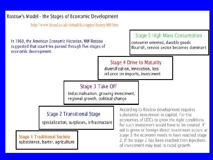 Rostow’s Model American economist and political advisor during 1950 s developed model, arguing that each country passes through five stages from traditional society to high mass consumption. ·TRADITIONAL SOCIETY – Development not started yet ·PRECONDITIONS FOR TAKE-OFF - elite group initiates economic innovations, leads to productivity and investments in infrastructure. ·TAKE-OFF - rapid growth in a number of specific economic activities, technical advances. ·DRIVE TO MATURITY - Modern technology diffuses to a wide variety of industries. ·AGE OF MASS CONSUMPTION - economy shifts from heavy industry (steel) to consumer goods (cars).