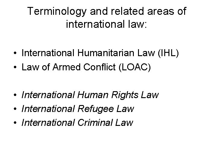 Terminology and related areas of international law: • International Humanitarian Law (IHL) • Law of Armed Conflict (LOAC) • International Human Rights Law • International Refugee Law • International Criminal Law