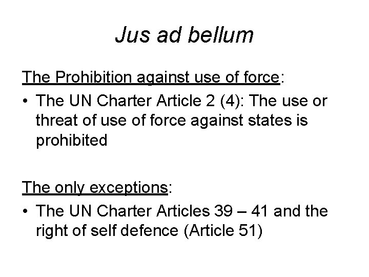 Jus ad bellum The Prohibition against use of force: • The UN Charter Article 2 (4): The use or threat of use of force against states is prohibited The only exceptions: • The UN Charter Articles 39 – 41 and the right of self defence (Article 51)