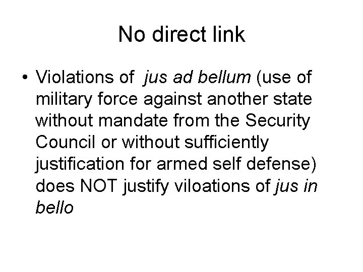No direct link • Violations of jus ad bellum (use of military force against another state without mandate from the Security Council or without sufficiently justification for armed self defense) does NOT justify viloations of jus in bello
