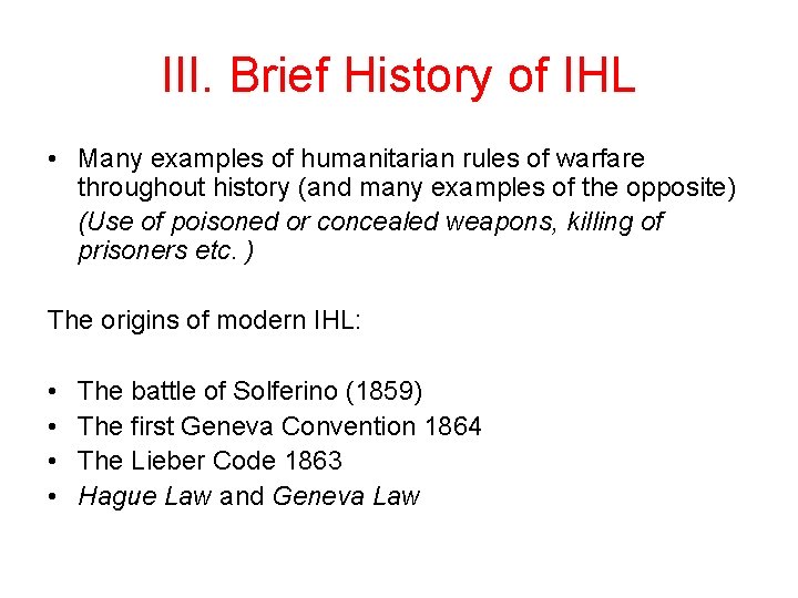III. Brief History of IHL • Many examples of humanitarian rules of warfare throughout history (and many examples of the opposite) (Use of poisoned or concealed weapons, killing of prisoners etc. ) The origins of modern IHL: • • The battle of Solferino (1859) The first Geneva Convention 1864 The Lieber Code 1863 Hague Law and Geneva Law