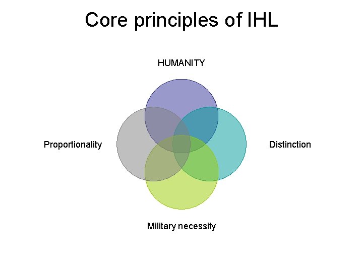 Core principles of IHL HUMANITY Proportionality Distinction Military necessity