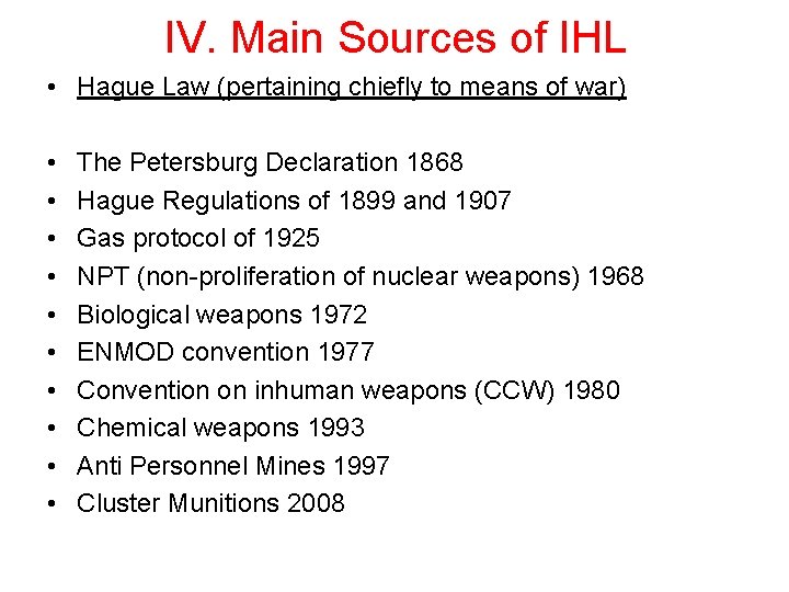 IV. Main Sources of IHL • Hague Law (pertaining chiefly to means of war) • • • The Petersburg Declaration 1868 Hague Regulations of 1899 and 1907 Gas protocol of 1925 NPT (non-proliferation of nuclear weapons) 1968 Biological weapons 1972 ENMOD convention 1977 Convention on inhuman weapons (CCW) 1980 Chemical weapons 1993 Anti Personnel Mines 1997 Cluster Munitions 2008