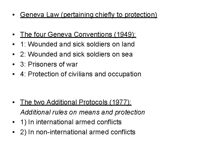 • Geneva Law (pertaining chiefly to protection) • • • The four Geneva Conventions (1949): 1: Wounded and sick soldiers on land 2: Wounded and sick soldiers on sea 3: Prisoners of war 4: Protection of civilians and occupation • The two Additional Protocols (1977): Additional rules on means and protection • 1) In international armed conflicts • 2) In non-international armed conflicts