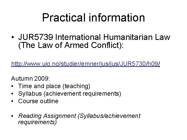 Practical information • JUR 5739 International Humanitarian Law (The Law of Armed Conflict): http: //www. uio. no/studier/emner/jus/JUR 5730/h 09/ Autumn 2009: • Time and place (teaching) • Syllabus (achievement requirements) • Course outline • Reading Assignment (Syllabus/achievement requirements)
