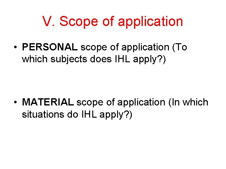 V. Scope of application • PERSONAL scope of application (To which subjects does IHL apply? ) • MATERIAL scope of application (In which situations do IHL apply? )