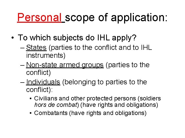 Personal scope of application: • To which subjects do IHL apply? – States (parties to the conflict and to IHL instruments) – Non-state armed groups (parties to the conflict) – Individuals (belonging to parties to the conflict): • Civilians and other protected persons (soldiers hors de combat) (have rights and obligations) • Combatants (have rights and obligations)