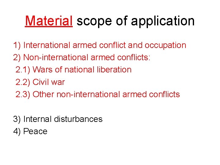 Material scope of application 1) International armed conflict and occupation 2) Non-international armed conflicts: 2. 1) Wars of national liberation 2. 2) Civil war 2. 3) Other non-international armed conflicts 3) Internal disturbances 4) Peace