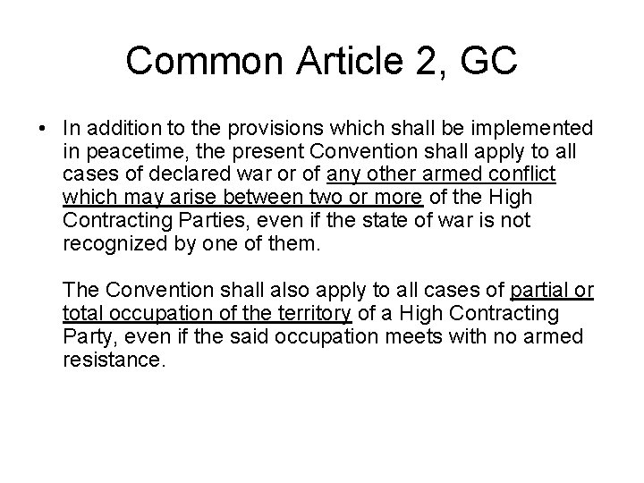 Common Article 2, GC • In addition to the provisions which shall be implemented in peacetime, the present Convention shall apply to all cases of declared war or of any other armed conflict which may arise between two or more of the High Contracting Parties, even if the state of war is not recognized by one of them. The Convention shall also apply to all cases of partial or total occupation of the territory of a High Contracting Party, even if the said occupation meets with no armed resistance.