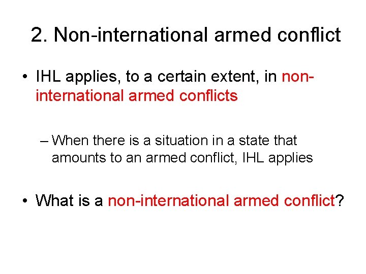 2. Non-international armed conflict • IHL applies, to a certain extent, in noninternational armed conflicts – When there is a situation in a state that amounts to an armed conflict, IHL applies • What is a non-international armed conflict?