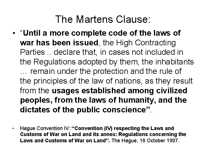 The Martens Clause: • “Until a more complete code of the laws of war has been issued, the High Contracting Parties. . declare that, in cases not included in the Regulations adopted by them, the inhabitants … remain under the protection and the rule of the principles of the law of nations, as they result from the usages established among civilized peoples, from the laws of humanity, and the dictates of the public conscience”. • Hague Convention IV: “Convention (IV) respecting the Laws and Customs of War on Land its annex: Regulations concerning the Laws and Customs of War on Land”. The Hague, 18 October 1907.