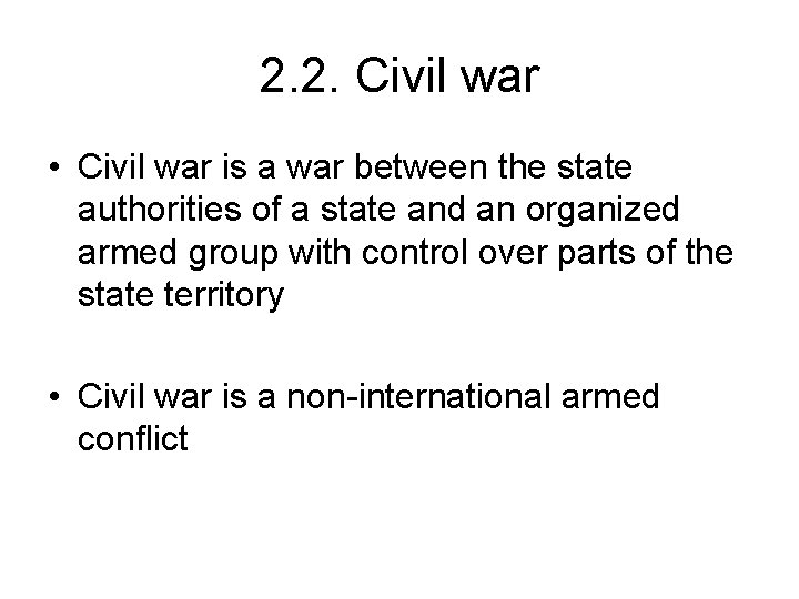 2. 2. Civil war • Civil war is a war between the state authorities of a state and an organized armed group with control over parts of the state territory • Civil war is a non-international armed conflict