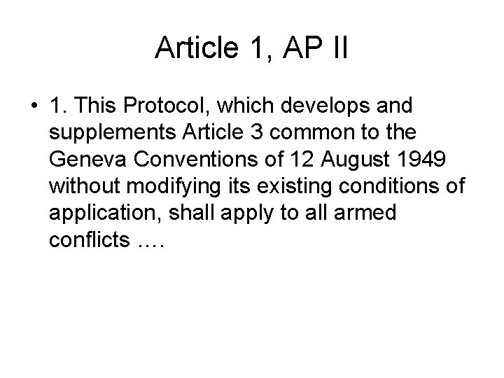 Article 1, AP II • 1. This Protocol, which develops and supplements Article 3 common to the Geneva Conventions of 12 August 1949 without modifying its existing conditions of application, shall apply to all armed conflicts ….