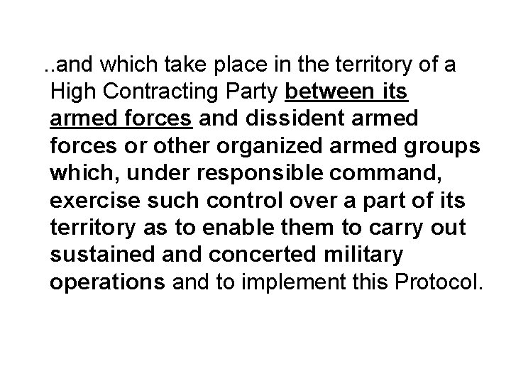 . . and which take place in the territory of a High Contracting Party between its armed forces and dissident armed forces or other organized armed groups which, under responsible command, exercise such control over a part of its territory as to enable them to carry out sustained and concerted military operations and to implement this Protocol.