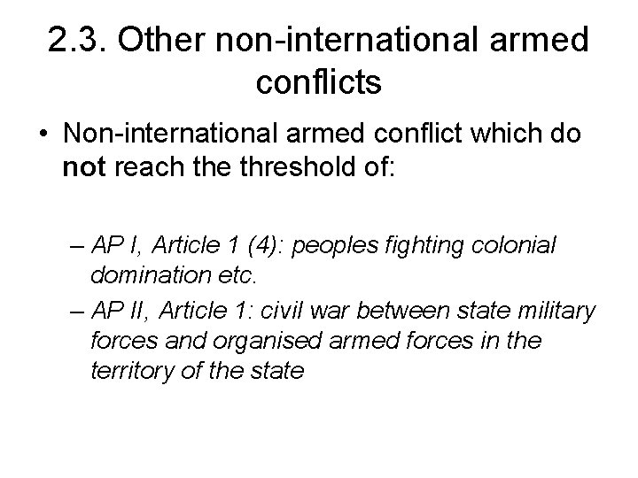 2. 3. Other non-international armed conflicts • Non-international armed conflict which do not reach the threshold of: – AP I, Article 1 (4): peoples fighting colonial domination etc. – AP II, Article 1: civil war between state military forces and organised armed forces in the territory of the state