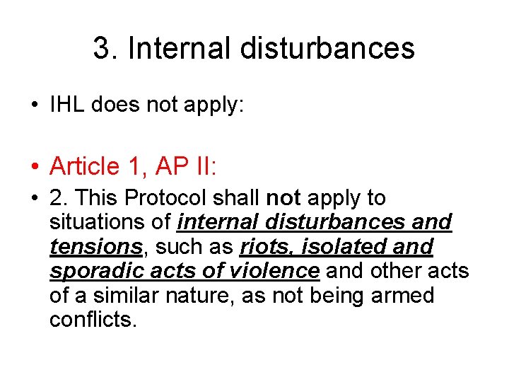 3. Internal disturbances • IHL does not apply: • Article 1, AP II: • 2. This Protocol shall not apply to situations of internal disturbances and tensions, such as riots, isolated and sporadic acts of violence and other acts of a similar nature, as not being armed conflicts.
