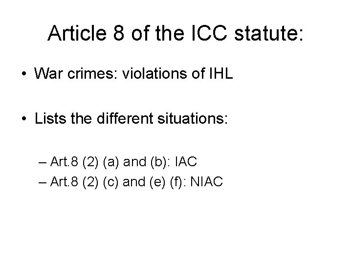 Article 8 of the ICC statute: • War crimes: violations of IHL • Lists the different situations: – Art. 8 (2) (a) and (b): IAC – Art. 8 (2) (c) and (e) (f): NIAC