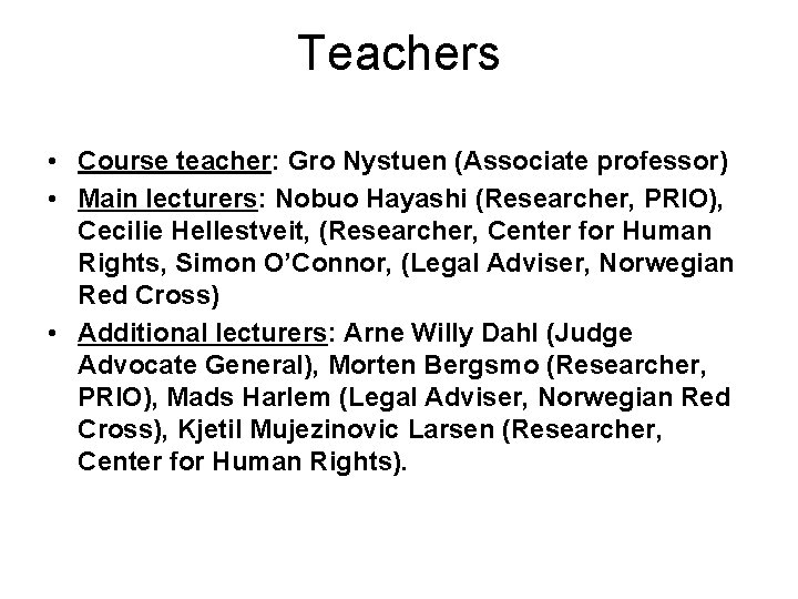 Teachers • Course teacher: Gro Nystuen (Associate professor) • Main lecturers: Nobuo Hayashi (Researcher, PRIO), Cecilie Hellestveit, (Researcher, Center for Human Rights, Simon O’Connor, (Legal Adviser, Norwegian Red Cross) • Additional lecturers: Arne Willy Dahl (Judge Advocate General), Morten Bergsmo (Researcher, PRIO), Mads Harlem (Legal Adviser, Norwegian Red Cross), Kjetil Mujezinovic Larsen (Researcher, Center for Human Rights).