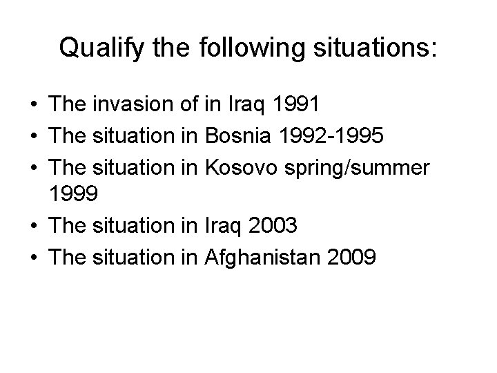 Qualify the following situations: • The invasion of in Iraq 1991 • The situation in Bosnia 1992 -1995 • The situation in Kosovo spring/summer 1999 • The situation in Iraq 2003 • The situation in Afghanistan 2009
