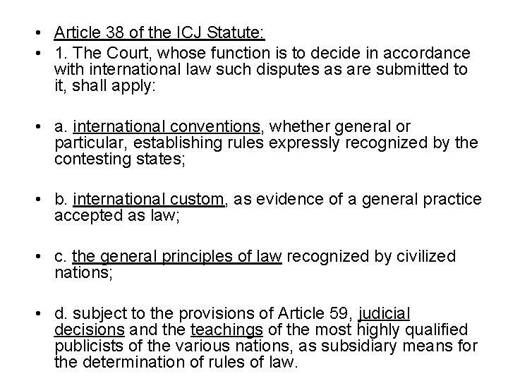 • Article 38 of the ICJ Statute: • 1. The Court, whose function is to decide in accordance with international law such disputes as are submitted to it, shall apply: • a. international conventions, whether general or particular, establishing rules expressly recognized by the contesting states; • b. international custom, as evidence of a general practice accepted as law; • c. the general principles of law recognized by civilized nations; • d. subject to the provisions of Article 59, judicial decisions and the teachings of the most highly qualified publicists of the various nations, as subsidiary means for the determination of rules of law.