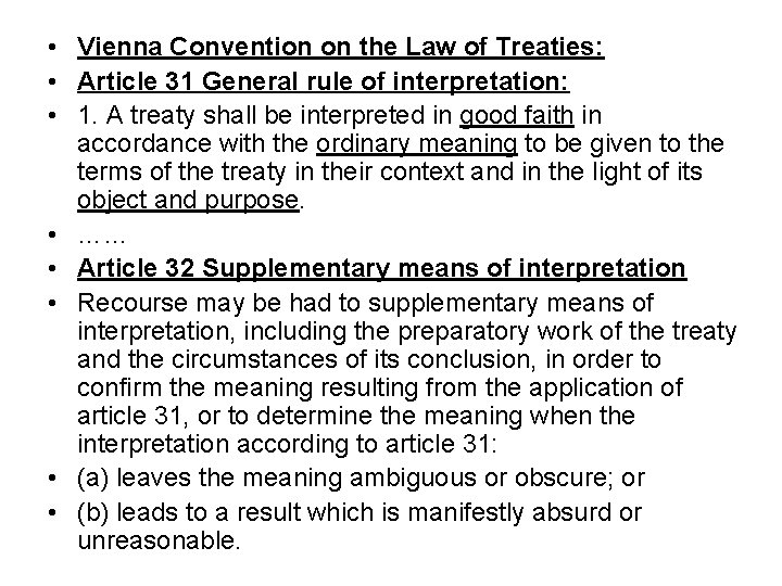• Vienna Convention on the Law of Treaties: • Article 31 General rule of interpretation: • 1. A treaty shall be interpreted in good faith in accordance with the ordinary meaning to be given to the terms of the treaty in their context and in the light of its object and purpose. • …… • Article 32 Supplementary means of interpretation • Recourse may be had to supplementary means of interpretation, including the preparatory work of the treaty and the circumstances of its conclusion, in order to confirm the meaning resulting from the application of article 31, or to determine the meaning when the interpretation according to article 31: • (a) leaves the meaning ambiguous or obscure; or • (b) leads to a result which is manifestly absurd or unreasonable.