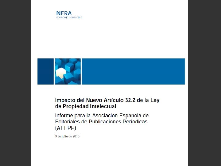 NERA Study highlights corrosive effect • Google News and smaller news aggregators discontinued their service • decline in website visits during the first three months after entry into force (Jan 2015) – 6, 1% on average – 5, 8% in the case of big publishers – 7, 1% in the case of average size publishers – 13, 5% in the case of smaller publishers = loss of market expansion effect of search results indicating newspaper contents