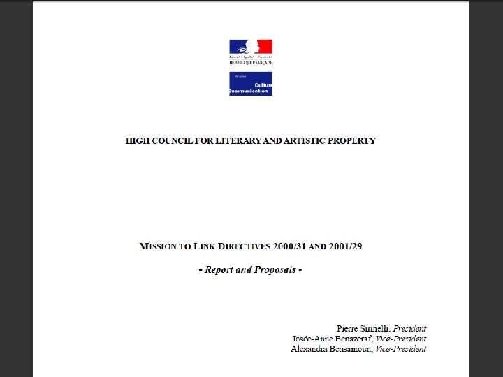 Impact on EU © Reform? ‘…as to whether the value generated by some of these new forms of online content distribution is fairly shared between distributors and rights holders. The Commission intends to address this through sector-specific regulation in the area of copyright. ’ (p. 8) • sector-specific regulation = regulation following the French proposal? • impact in practice?