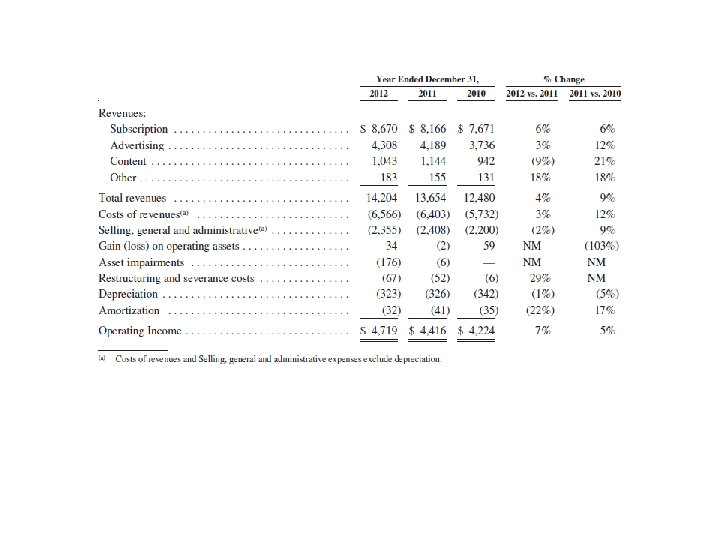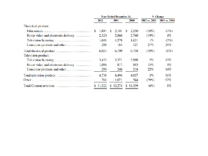 The components of Costs of revenues for the Film and TV Entertainment segment are as follows (millions): Publishing. Revenues and Operating Income of the Publishing segment for the years ended December 31, 2012, 2011 and 2010 are as follows (millions):