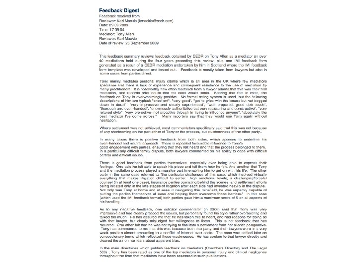 Feedback Digest • Each Mediator appoints a “Reviewer” – Independent person/institution of their choice – Summarizes feedback from prior users – In line with IMI Guidelines • Protects Mediators from one-off negatives • Negatives only captured if repeated +3 times • Provides users with transparency on: • Competency • Suitability