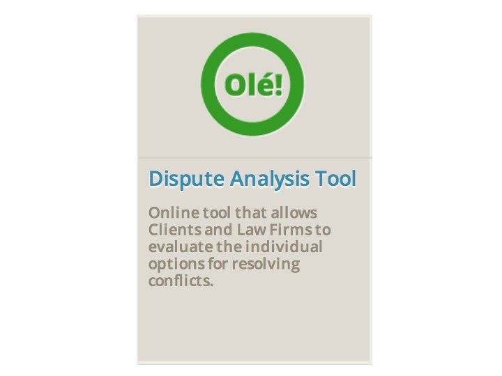 Olé! – Evaluation of Conflicts • Helps parties regain control via a strategic, outcome-orientated decision-making process • A collaborative process for Client and Law Firm • Short, quick and simple • Stimulates the right questions and answers • Can be completed in electronic form by email