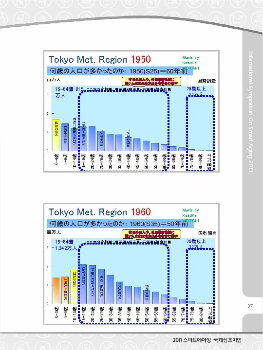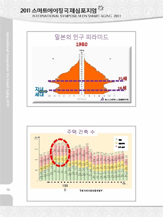 International Symposium On Smart Aging 2011 There are some other interesting characteristics on baby boomers, other than the amount of population. Firstly, they have large number of brothers and sisters. Seeing the transition of total fertility rate, which means average number of babies that a woman give birth to through her life, it was more than 4 babies in the years when baby boomers were bone. Thinking of the fact simply, they have four brothers or sisters in average. The number exceeds the number of their parents so that it can be said that they naturally had potential demand of new housing. Secondly, we should pay attention to the fact that coincidently the years when they were young and the years when the huge immigration into cities from countries were approximately same. When the age that baby boomers were in their childhood, larger amount of people were lived in countryside. High economic growth which stated since 1960 s developed and expanded the metropolitan urban areas where factories, offices and educations are concentrated, and they absorbed huge amount of young population into there. Being excess population in the countryside, they left their hometowns to take the opportunity of getting a job or admission of school, moved to the metropolises. Actually, about half of baby boomer population has been stayed in the three major metropolitan regions until now. Thirdly, the generation of baby boomer juniors was produced by them. The junior generation, which was born around from 1971 to 1974, also forms a population peak, though a little smaller than their parent generation. Currently, they are in their latter half of 30 s. Concerning to housing demand, in the latter half of 1980 s, when the junior generation was in their adolescent of high teen age and required their own bedrooms, there occurred a housing construction boom. Housing market in Japan has a interesting characteristics that there are distinctive floor size gap between rental housing and owned housing. As the result of that, large number of baby boomer families in the metropolitan regions bought their larger house in the suburbs. Currently, half of the baby boomers are living in the three major metropolitan regions, and approximately 80% of them are in their owned house. It could be said that “living in their owned house in the suburb of metropolis” is one of typical lifestyle of the baby boomers. However, and importantly, the junior generation has not produced their babies, which is different fo their parent generation. Recently, total fertility rate in Japan has been less than 1. 5. As the result, “Declining Children” emerged as a big social problem in addition to the “Aging”. The shape of population pyramid has been distorted much more. It creates inevitable social and economic problems for national policies in the long run, with long succession to the future. 61