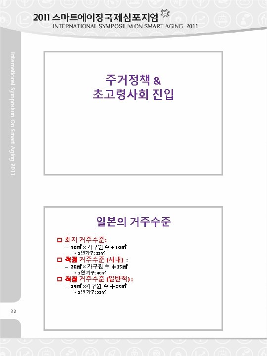 International Symposium On Smart Aging 2011 Housing Policy & coming Super Aged Society Housing Standards of Japan p Minimum Housing Standard: – 10㎡ × household members +10㎡ • Singles: 25㎡ p Desirable Housing Standard (Urban) : – 20㎡ × household members +15㎡ • Singles: 40㎡ p Desirable Housing Standard (General) : – 25㎡ × household members +25㎡ • Singles: 55㎡ 33