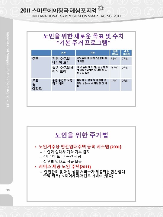 Monthly Category Income(A) Living Cost (B) Housing Cost (C) C/A C/B Self-own 339. 0 221. 5 45. 7 13. 5 20. 6 Rent 256. 2 158. 0 57. 3 22. 4 36. 3 Self-own 321. 0 194. 5 53. 7 16. 7 27. 6 Rent 229. 7 140. 1 44. 8 19. 5 32. 0 Self-own 283. 8 162. 9 51. 7 18. 2 31. 7 Rent 189. 3 108. 6 44. 8 23. 7 41. 3 Self-own 209. 2 124. 2 51. 5 24. 6 41. 4 Rent 137. 0 85. 0 37. 5 27. 3 44. 0 Self-own 154. 5 98. 1 45. 7 29. 6 46. 6 Rent 112. 7 70. 2 32. 4 28. 8 46. 2 46~50 51~55 56~60 61~65 66~70 Note: The housing cost is estimated using the user cost of the housing price in case of the self-own house owners. And, in case of the household living in rental houses, the monthly rent was used. International Symposium On Smart Aging 2011 <Table 21> Living and Housing Cost by the Age of the Householder (Unit : KRW 10000, %) Especially, the housing cost of the household living in rental houses was high. Therefore, it is likely that the low income bracket of the baby boom generation faces serious situation. 4. 3 Insufficient Housing Policy by the Age The current hosing policy is for the newly established household, low and middle income brackets and old aged households, etc. As the <Table 22>, current housing policy considers the features of the family members such as the aged and the disabled. Therefore, there is no economic support for the baby boom generation which does not fall into the category of the low income bracket or the aged although their housing stability faces in great risks because of income reduction. 117