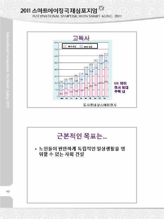 Categories Housing Units Condominiums & Apartments Detail Current (2008) Goal (2020) Basic Level of Barrier-Freed with no difference level of floor or with more than two handrails 37% 75% Higher Level of Barrier-Freed with no difference level of floor, with more than two handrails and width of corridor that available to a wheelchair 9. 5% 25% Universal Design in Common Spaces with sequentially passage available for a wheelchair and a baby buggy from road front entrance to unit entrance 16% 28% International Symposium On Smart Aging 2011 New Goals & Indicators for Elders “Basic Program for Housing” Housing Law for Elderly People • Registration System of Private Rental Housing for Elders (2001) – Not Refuse the Rental Contract with Aged People – With Barrier Freed Rooms – Rent Guarantee by Government is Available • Housing for Elders with Supportive Services (2011) – Private Rental Housing with Safety Watch & Daily Consultation (obliged), & with Day Care or Nursing Service (facilitated) 47