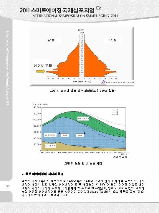 International Symposium On Smart Aging 2011 Fig. 4: Population Pyramid by Ages (Japan, 1960) Fig. 5: Labor Force & Non Labor Force Generation 2. Characteristics of Baby Boomer Generation in Japan In Japan, baby boomers mean the generation who bone during three years from 1947 to 1949 in general. The baby boomer generation has approximately 30% extra population per year than the nearby generations, and that is why they always have been producing large amount of demand to the national economy as they grew older, as well as leaving surplus facilities after they passed. The baby boomers are often called in Japan as “the Mass Generation”, according to the title of a novel written by Taichi Sakaiya. 59