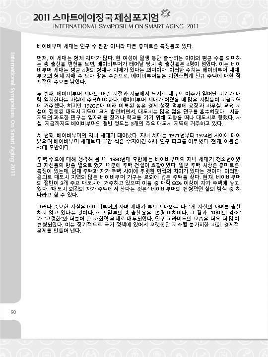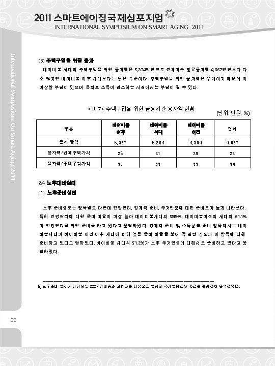 <Table 8> Rate of Preparing the Post-Retirement (Unit : %) Before Baby Generation Boom 33. 6 50. 2 46. 0 Income Creation 40. 3 47. 9 42. 3 Health Care 49. 0 58. 9 61. 1 leisure Time Preparation 21. 9 36. 9 39. 7 Housing Stability 32. 6 51. 2 55. 3 Inheritance Preparation 14. 5 18. 8 20. 1 Number of Relevant Households 14, 561 3, 087, 850 2, 441, 313 After Baby Boom Financial Preparation Note 1: As of 2007, the baby boom generation is 44~52 years old, the generation after the baby boom is 53~61 years old and the generation before the baby boom 35~43 years old. Note 2: The figure on the table is the ratio of households that answered that they are preparing for the category. Resource: 2007 Korea Housing Survey (surveyees who are in their 35's and older ) In terms of the financial preparation and income creation part, the baby boom generation is the International Symposium On Smart Aging 2011 Baby Boom Category most well prepared comparing with the generation before and after the baby boom. A total of 51. 2% of the baby boom generation is preparing for their housing stability in their old life. The baby boom generation and the generation before the baby boom put more weight on savings, public pension and private pension for the old life preparation. On the other hand, the generation after the baby boom puts much weight on purchasing real estates besides public and private pension. They don't put much weight on savings in preparing their old life. <Table 9 > Financial Planning for the Post-Retirement Baby Boom (Unit : %) Category After Baby Boom Savings 4. 7 29. 7 31. 0 Public Pension 39. 2 30. 5 31. 9 Private Pension 24. 8 31. 8 25. 0 Real Estate for Rental Income 21. 6 3. 4 6. 2 Depending on Children or Relatives - 0. 0 0. 3 Selling Real Estate Property or Loan - 3. 2 4. 1 Others 9. 6 1. 3 1. 5 Total 100. 0 Generation Before Baby Boom Note: The results only include the answers from the household answering that they are preparing the old life Resources: 2007 Korea Housing Survey (surveyees who are in their 35's and older ) 93