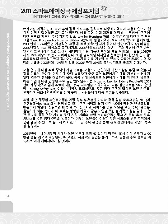 International Symposium On Smart Aging 2011 Starting 21 century, the goals of the national housing policy has moved into diversified quality goals, in which the goals relates to aged people are to be focusing points. For example, concerning “barrier-freed” housing, which means impediment removal, the goals and indicators are established in “the Basic Program for Housing (National)” under the Basic Law for Housing, such as increase the rate of houses with the basic level of barrier-freed (which is with no difference level of floor or with more than two handrails) to more than 75% until 2020 (37% in 2008) and also increase the rate of houses with the higher level of barrier-freed (which is with no difference level of floor, with more than two handrails and width of corridor that available to a wheelchair) to more than 25% until 2020 (9. 5% in 2008). Also, as a goal rerates to universal design, it was set to increase the rate of apartment and condominium houses with sequentially passage available for a wheelchair and a baby buggy from road front entrance to unit entrance to 28% until 2020 (16% in 2008). Fundamental goal of housing policy for aged people is to build a society that aged people is able to enjoy their own daily life independently with comfort. Elderly people of single often tend to refuse to rent by private rental housing owners. Facing these problems, the Law on Stable Supply of Housing for Elderly People (Housing Law for Elderly People) was established in 2001 and started the registration system on rental houses that is not refuse aged residents with public rent guarantee. On the other hand, a concept of “Housing Safety Net” was introduced and the role of public rental housing was focusing more on socially disadvantaged people including aged families. Moreover, recent revised Housing Law for Elderly People was focused on the issue that making strong linkage between housing policy and welfare policy, each of which in charge of Ministry of Land, Infrastructure, Transport and Tourism (NLIT) and Ministry of Health, Labor and Welfare (MHLW), as well as each divisions of local governments. One of the actual measures is facilitating supply of “Housing for Elderly People with Supportive Services”, which is the kind of rental housings with physical equipments for elders such as flat floor, with daily supportive services as well such as keep in touch service for safety watching, daily consultation service (obliged) and care or nursing service (if needed). The Government facilitates to prevail the lifestyle of elders which living in their house with easily available supportive services. However, number of this sort of housing is absolutely insufficient in current situation. In 2025, it is estimated that population of more than 75 years old will be exceeded 21 million, because the baby boomer generation will join the old elderly age. Toward super aging society which is inevitable, Japanese housing policy is compelled to steady prepare for it. 71