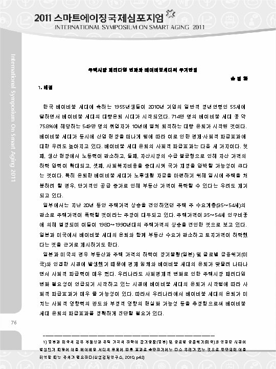 Paradigm shift in housing market and housing stability of baby boomers 주택시장 패러다임 변화와 베이비부머의 주거안정 주거분야 Son, Kyoung Hwan International Symposium On Smart Aging 2011 Presentation 2 Vice President, Korea Research Institute for Human Settlements 75