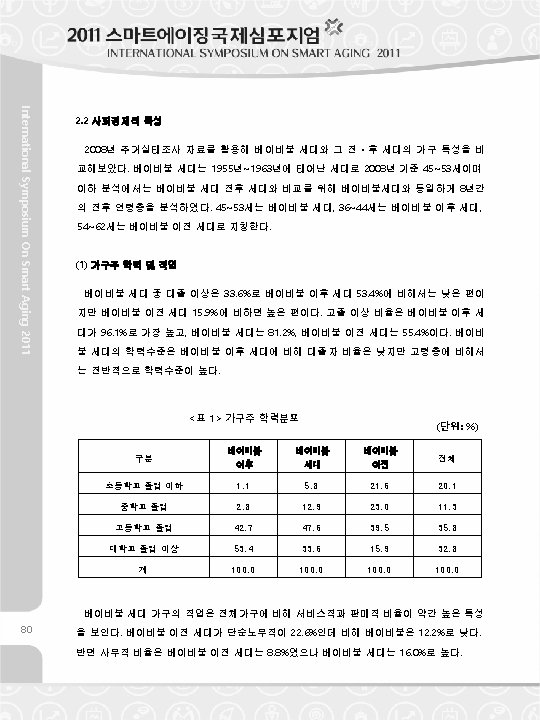 2. 2 Socio- economic Features generation and the generations before and after the baby boom generation were compared. The baby boom generation refers to those people who were born between 1955 and 1963. As of 2008, they become 45 ~ 53 years old. For the comparison the age group was classified in each eight years as follows; Those who are 45 ~ 53 years old is the baby boom generation, those who are 36~44 belong to the group before the baby boom generation and those who are 54 ~ 62 belong to the group after the baby boom generation. (1) Educational Level and Occupation of the Householder Among the baby boom generation, the number of people with educational attainments equal to and higher than those of university graduate accounts for 33. 6%, which is lower than that of the generation who were born after the baby boom generation, but higher than that of the generation who were born before the baby boom generation. In case of the number of people with educational attainments equal to and higher than those of high school graduate, the generation after the baby boom takes the highest rate as 96. 1% followed by the baby boom International Symposium On Smart Aging 2011 Using the results of 2008 Korea Housing Survey, the housing features of the baby boom generation with 81. 2% and the generation before the baby boom with 55. 4%. The baby boom generation has high educational attainments generally comparing with the old age group although the rate of university graduate is lower than that of the generation after the baby boom. <Table 1> Distribution of the Educational Level of the Householder Category Elementary School Graduate or After Baby Boom Generation (Unit : %) Before Baby Boom Total 1. 1 5. 8 21. 6 20. 1 Junior High School Graduate 2. 8 12. 9 23. 0 11. 3 High School Graduate 42. 7 47. 6 39. 5 35. 8 University Graduate 53. 4 33. 6 15. 9 32. 8 Total 100. 0 under In case of the occupation of the baby boom generation, the sales and service work accounts for the higher rate. A total of 22. 6% of the generation before the baby boom engaged in the simple labor work. However, a total of 12. 2% of the baby boom generation engaged in the simple labor work, which is lower rate than that of the generation after the baby boom. In case of the office work, the generation before the baby boom accounts for 8. 8% and the baby boom generation accounts for 16. 0%, which is higher than that of the generation before the baby boom. 81
