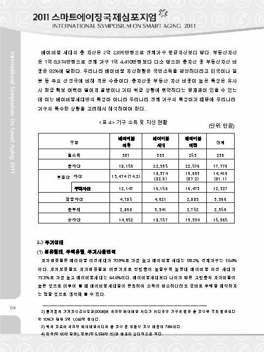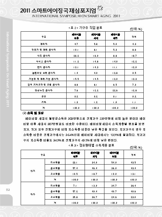 <Table 2> Occupation Distribution of the Householder (Unit : %) Baby Boom Before Baby Boom Generation Boom Manager 4. 7 5. 8 5. 0 4. 3 Professional and Relevant Occupation 10. 1 8. 1 5. 3 8. 6 Office Work 26. 2 16. 0 8. 8 18. 7 Service 11. 2 14. 8 14. 0 12. 2 Sales 13. 1 14. 3 11. 1 12. 0 Agriculture, Forestry and Fishery 1. 4 4. 9 12. 8 9. 5 Technician and Relevant Occupation 15. 5 14. 5 12. 9 13. 3 Mechanician and Assembly Work 8. 8 8. 1 6. 5 7. 3 Simple Labor Work 7. 6 12. 2 22. 6 12. 8 Soldier 0. 2 0. 1 0. 2 Others 1. 3 1. 2 1. 0 1. 1 Total 100. 0 (2) Income & Assets Total International Symposium On Smart Aging 2011 After Baby Category The average monthly income of the baby boom generation is KRW 3. 03 million, which is higher than the average of total households of KRW 23. 9 million and similar to that of the generation after the baby boom that is KRW 3. 07 million. The income level of the low income bracket of the rental household is 34. 9% and it is lower than that of entire household average of 43. 5% <Table 3> Income Level by the Housing Occupation Type After Baby Boom Category Rent Self- owned Baby Boom Generation (Unit : %) Before Baby Boom Total Low Income 23. 1 34. 9 54. 0 43. 5 Middle Income 57. 4 46. 4 36. 0 43. 4 High Income 19. 5 18. 7 10. 0 13. 1 Total 100. 0 Low Income 7. 1 13. 9 34. 7 36. 4 Middle Income 57. 2 49. 4 40. 7 40. 6 High Income 35. 8 36. 7 24. 6 23. 0 Total 100. 0 83