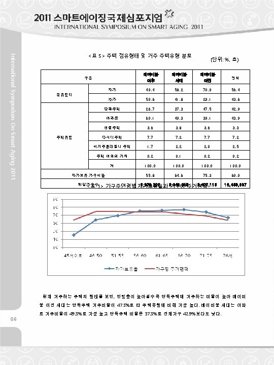 <Table 5> Type of Occupation & Type of Living in Houses (Unit : %, No. ) Baby Boom Before Baby Boom Generation Boom Self- owned 49. 4 58. 2 70. 9 56. 4 Rent 50. 6 41. 8 29. 1 43. 6 Detached House 26. 7 37. 3 47. 5 42. 9 Apartment 60. 1 49. 3 39. 1 43. 9 Row House 3. 6 3. 8 3. 6 3. 3 Multiplex House 7. 7 7. 2 1. 7 2. 2 2. 0 2. 5 0. 2 0. 1 0. 2 100. 0 Ratio of Self-owned Houses 55. 8 64. 6 75. 3 60. 9 Number of Houses 3, 670, 202 3, 346, 358 2, 427, 113 16, 439, 967 Tenure Type House Type Residing in Nonresidental Building Other Places than Houses Total International Symposium On Smart Aging 2011 After Baby Category <Figure 1> Self-owned rate and using area per household by the age of the householder Taking a look at the housing type, the ratio of living in detached house is higher in older age group. In case of the generation before the baby boom, the ratio of living in detached house is the highest as 47. 5% comparing with other type of houses. In case of the baby boom generation, the ratio of living in apartment is the highest as 49. 3%. The ratio of living in detached house is 37. 3%, which is lower than 42. 9% of the entire household. 87
