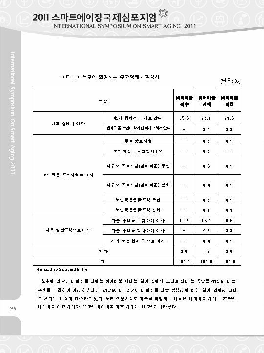 (2) Measures to Plan Living Expenses for Post-Retirement pension as the most effective method to prepare golden years. On the other hand, the generation before the baby boom said that the public pension is the most effective method. The baby boom generation depends more on the private pension than the public pension. <Table 10 > The Most Effective Method to Plan the Post-Retirement (Unit : %) Baby Boom Before Baby Generation Boom - 28. 7 27. 5 Public Pension 23. 6 29. 7 35. 1 Private Pension 40. 9 32. 4 20. 7 Real Estate for Rental Income 35. 5 5. 3 9. 7 Depending on Children or Relatives - 0. 0 0. 3 Selling Real Estate Property or Loan - 3. 0 4. 7 Others - 0. 8 2. 1 Total 100. 0 Category After Baby Boom Savings International Symposium On Smart Aging 2011 The baby boom generation and the generation after the baby boom consider the private Note: The results only include the answers from the household answering that they are preparing the old life Resources: 2007 Korea Housing Survey (surveyees who are in their 35's and older ) (3) Desired Housing Type for the Post-Retirement Life In case of the desired housing type in their golden years, surveys were done by separating the situation when they are healthy and when they are not. With no health problem, surveyees prefer to live in their current houses. A total of 79. 5% of the generation before the baby boom, 73. 1% of the baby boom generation and 85. 5% of the generation after the baby boom answered that they prefer to live in their current houses if they don't have any health problem. 95