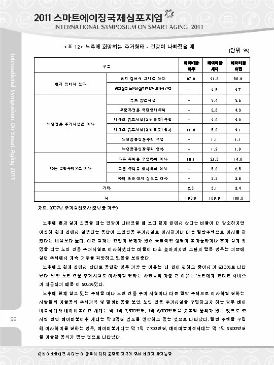 (Unit : %) After Baby Boom Category Move to Other Houses Generation Before Baby Boom Living in current house 85. 5 73. 1 79. 5 Remoden il gcurenthouseforagedfile - 3. 0 3. 8 Free institutions for the aged - 0. 3 0. 1 National rental houses for the aged - 0. 6 1. 1 Purchase the large scale silver town - 0. 5 0. 1 Rent the large scale silver town - 0. 4 0. 1 Purchase the cohabitation house for the aged - 0. 3 0. 1 Rent the cohabitation house for the aged - 0. 1 0. 3 Move to other house (purchase) 11. 9 15. 2 9. 5 Move to other house (rent) - 4. 8 3. 3 Move to the house of children or relatives - 0. 4 0. 1 Others 2. 6 1. 5 2. 0 Total 100. 0 Current House Facility for Aged Persons Baby Boom International Symposium On Smart Aging 2011 <Table 11> Desired Housing Type for the Post-Retirement Life - When Healthy Resources: 2007 Korea Housing Survey (surveyees who are in their 35's and older ) When theirs health gives way, 41. 9% of the baby boom generation answered that they would live in their current house and 21. 3% of them answered that they would move to other houses they purchase. Comparing with the case of good health, the ratio of surveyees who answered that they prefer to live in their current house decreased. The ratio of desiring to move to the exclusive facility for the aged is as follows; the baby boom generation is 20. 9%, the generation before the baby boom 21. 0%, and the generation after the baby boom is 11. 6% respectively. 97