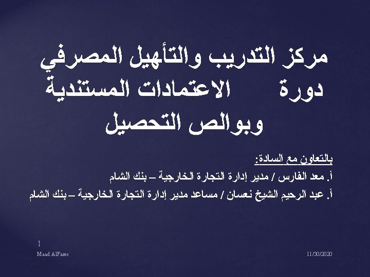 International Trade Consideration { MAAD AL FARES Foreign Trade Manager CHAM BANK E-MAIL m. alfares@chambank. com 2 Maad Al. Fares 11/30/2020