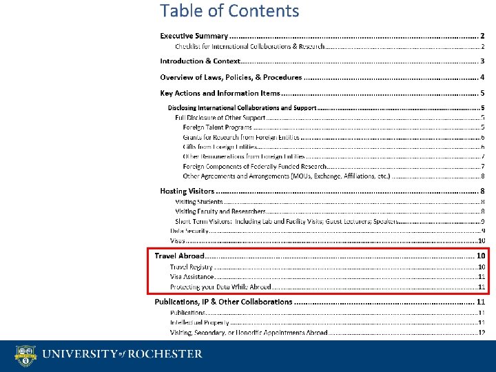 Travel Abroad § International travel is an integral part of the academic, research, and healthcare mission of the University of Rochester, and the University broadly encourages and supports international travel by its faculty, staff, and students in support of that mission. § Office for Global Engagement works to support Rochester’s travelers abroad and provides a variety of predeparture resources for students faculty and staff.