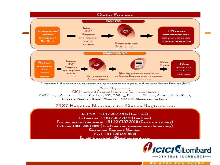 Claims Process – ICICI Lombard Tie-up with Europ Assistance (ASP) Reimbursement & Cashless settlement for medical emergencies abroad Financial emergency is given abroad by the ASP Tie-up with UHG Allied with United Health Group (UHG), one of the largest health care companies in the U. S. Provides access to UHG network of hospitals & physicians, Constitutes access to about 86% of acute care hospitals, ~4, 800 medical facilities, OPD centers and ~60, 000 pharmacies throughout the U. S. All our customers traveling to the U. S now receive a co-branded card as a part of the policy